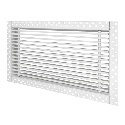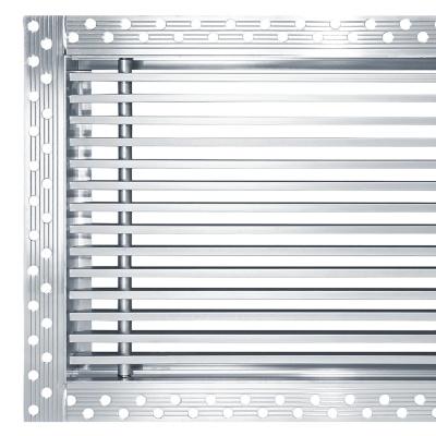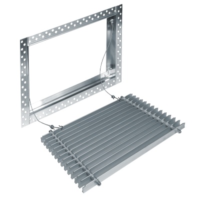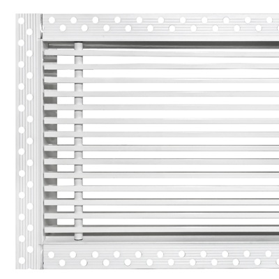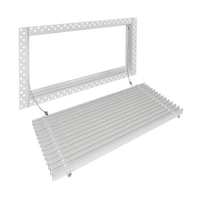 Данная решетка подходит для монтажа на любую поверхность под финишную отделку. Рамка и экран изготовлены из алюминия, опора экрана - из оцинкованной стали. Рама оснащена «полкой» 1,9 мм и рифлеными краями для большей адгезии финишного материала – шпатлевки, цемента. Решетка имеет съемную центральную часть с фиксированным углом наклона ламелей 15°. Она крепится к корпусу прочными металлическими тросиками, легко снимается для очистки и удобного обслуживания.