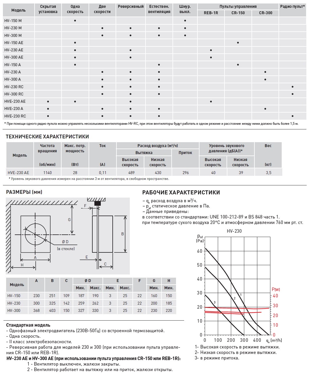 Вентиляторы поставляются с решетками из высококачественного ABS пластика, автоматическими жалюзи и однофазными электродвигателями (230В-50Гц). Вентиляторы имеют класс защиты IPX4 и II класс электробезопасности.