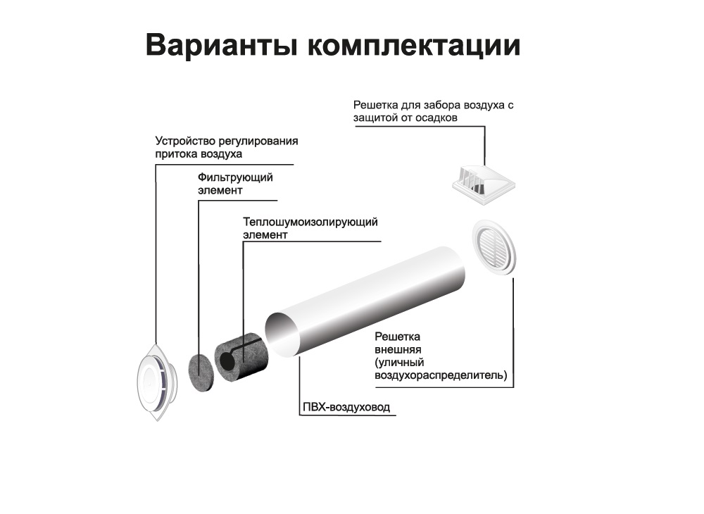 Устройство представляет собой трубу с теплошумоизоляционными свойствами и фильтрующими элементами. Снаружи закрывается решеткой. Изнутри – заслонкой с ручкой регулировки воздушных потоков.